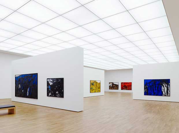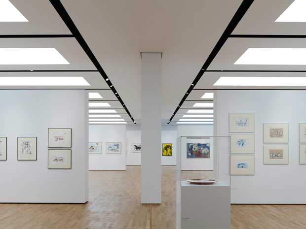 La iluminación interior de las salas de exposición prácticamente se pre-defininió siguiendo la arquitectura del edificio. El techo de vidrio existente inspiró a los diseñadores de iluminación para iluminar todas las estancias del edificio a través de techos luminosos o campos de luz. En la planta superior una claraboya se extiende por todo el espacio. Marcos cuadradas encajados en un montaje tensado de membranas difusoras suspendidas por debajo del techo con juntas mínimas entre ellos. Entre la superficie de la membrana y el techo de cristal se han situado luminarias que se regulan dependiendo de los niveles de luz. Por la noche, proporcionan la iluminación interior. Por razones estructurales y climáticas se ha situado una cubierta de cristal de seguridad sobre el techo de cristal. Instalado en el mismo hay un sistema de láminas de seguimiento solar, que bloquea la luz solar directa y por lo tanto evita el sobrecalentamiento de las salas y protege las obras de arte contra la radiación perjudicial.