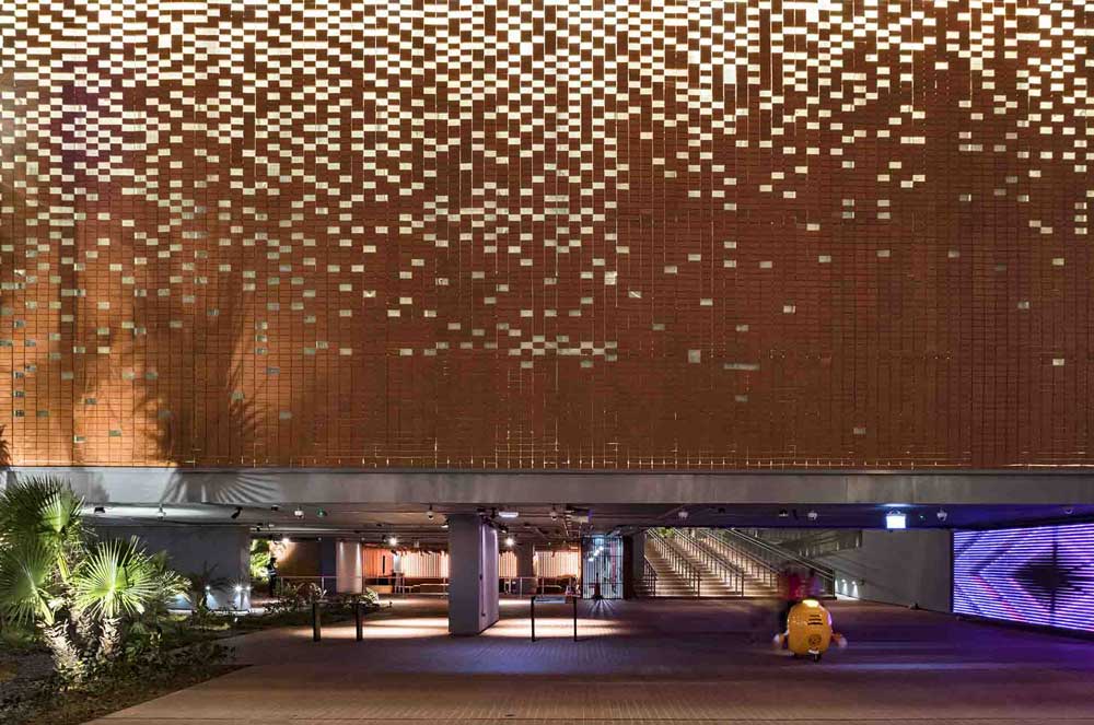 La plaza, en el nivel superior, está organizada, de acuerdo con su variado programa, en zona de circulación, varios espacios estanciales y un área de colas para acceder a la exposición principal. «Debido a su gran superficie, el reto de la iluminación era conseguir darle una escala humana y compartimentar el espacio a nivel perceptivo para crear diferentes zonas según el uso. Para ello, además de emplear luz cálida y controlada para evitar deslumbramientos, aplicamos una superposición de capas de luz que se adecuan al uso, creando un espacio dinámico y acogedor para que los visitantes disfruten de su experiencia».