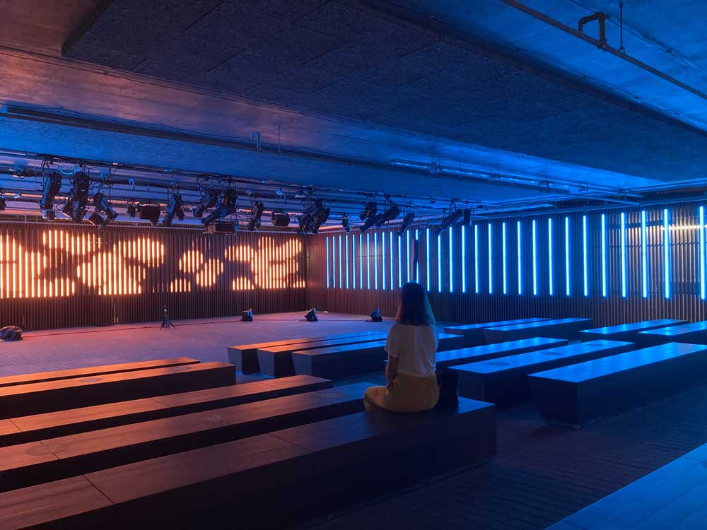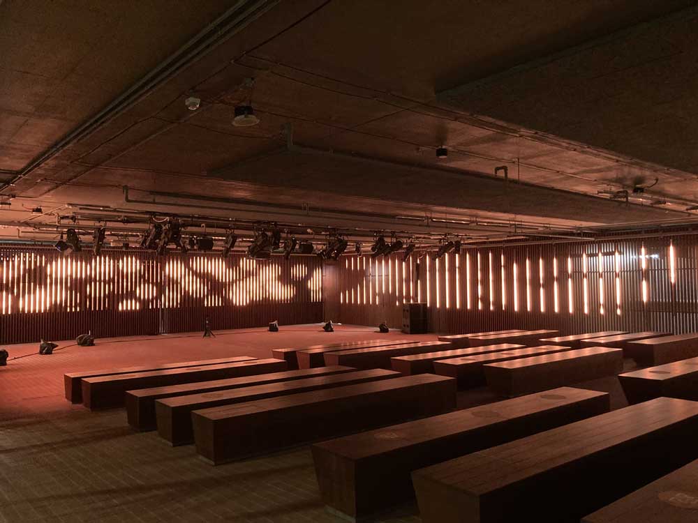 Por un lado, los tubos de luz entre los listones verticales de madera de los paramentos laterales del anfiteatro iluminan la zona de asientos y, al igual que en la pared del fondo, también sirven de soporte para contenido visual a gran escala. La disposición de los tubos hace que se perciban de manera diferente dependiendo del punto de vista, provocando un efecto similar al de una obra de Op Art y enfatizando el dinamismo del espacio.