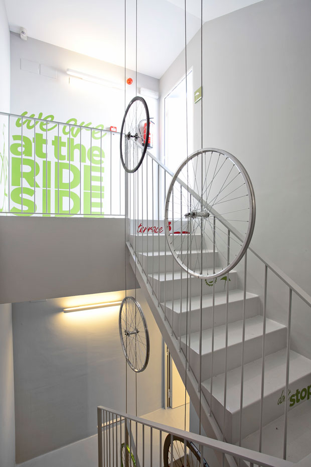 El interiorismo, nuevamente, se inspira en un deporte urbano que tiene toda una filosofía de vida detrás: las fixed gear bikes -bicicletas de piñón fijo-. Sobre él se apoya la elección de materiales y el diseño de objetos y mobiliario.