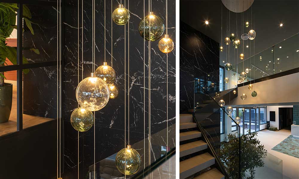 Presidiendo el núcleo de escaleras, una coreografía de luminarias MURANÉ de PANZERI, activa el hueco central mediante una constelación de esferas de vidrio soplado. Esta intervención trasciende lo decorativo y convierte el tránsito vertical en un recorrido experiencial donde la luz adquiere una forma etérea y flotante. Las transparencias y reflejos producidos añaden profundidad a un espacio de atmósfera escenográfica.