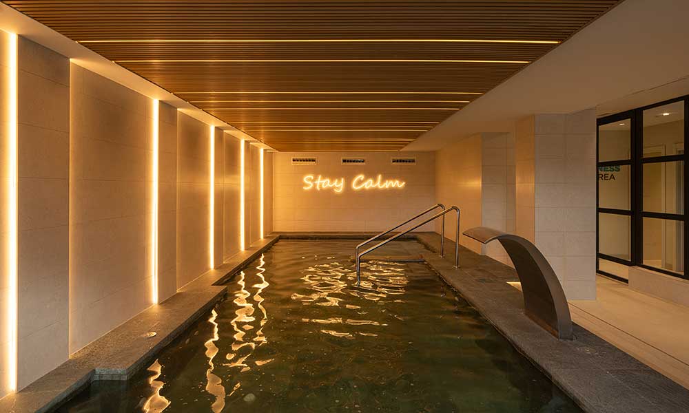 En la piscina interior, la integración de los sistemas lumínicos generan ritmo visual a través de trazos verticales y horizontales alineados. En los distribuidores comunes, refuerzan la continuidad espacial con una presencia tenue y constante. Además de combinar diseño y confort, estas soluciones aportan coherencia visual a la experiencia lumínica del conjunto.