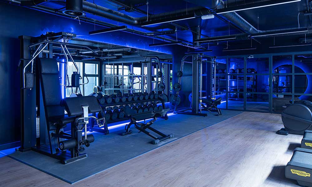 En el gimnasio, esta misma solución adquiere un lenguaje cromático que define su identidad. El proyecto recurre a sistemas lineales como hilo conductor del diseño lumínico. Los perfiles y tiras led se integran en la sala de cine, donde subrayan contornos y guían el recorrido.