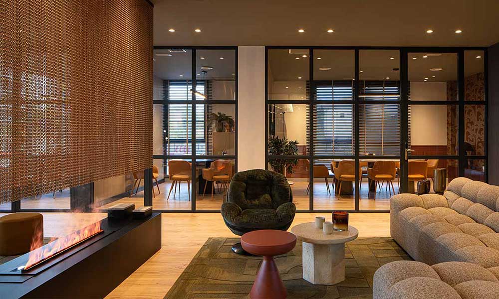 En el lobby, la composición de luminarias BELLA de PANZERI configura un gesto escultórico que introduce al visitante en un espacio de bienvenida amable y sofisticado. Suspendidas a diferentes alturas, las luminarias dialogan con la textura cerámica de fondo, aportando sutiles brillos y la iluminancia precisa el área de recepción.