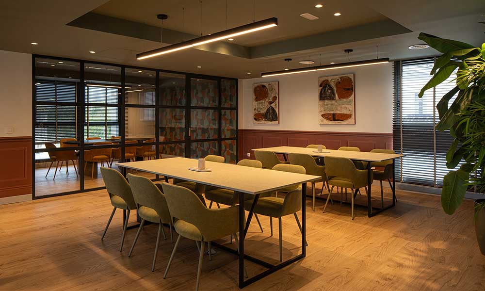 En las salas de reunión y salas polivalentes, las luminarias lineales suspendidas aportan una luz homogénea que favorece el uso versátil del espacio.