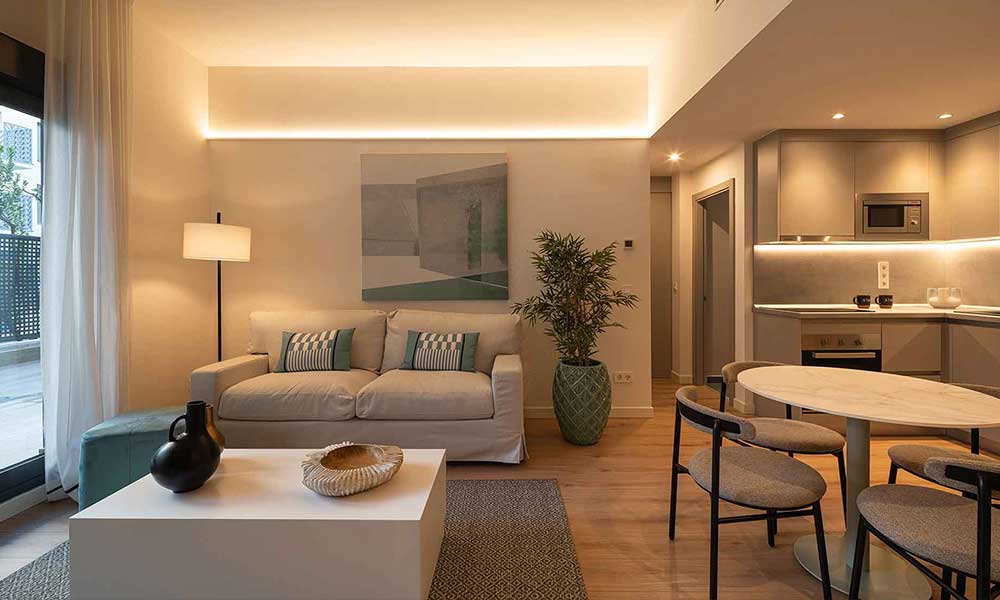 Las líneas de luz indirecta en dormitorios, salones y aseos generan calma y equilibrio, mientras que los perfiles integrados en la cocina iluminan con precisión la superficie útil de la encimera.